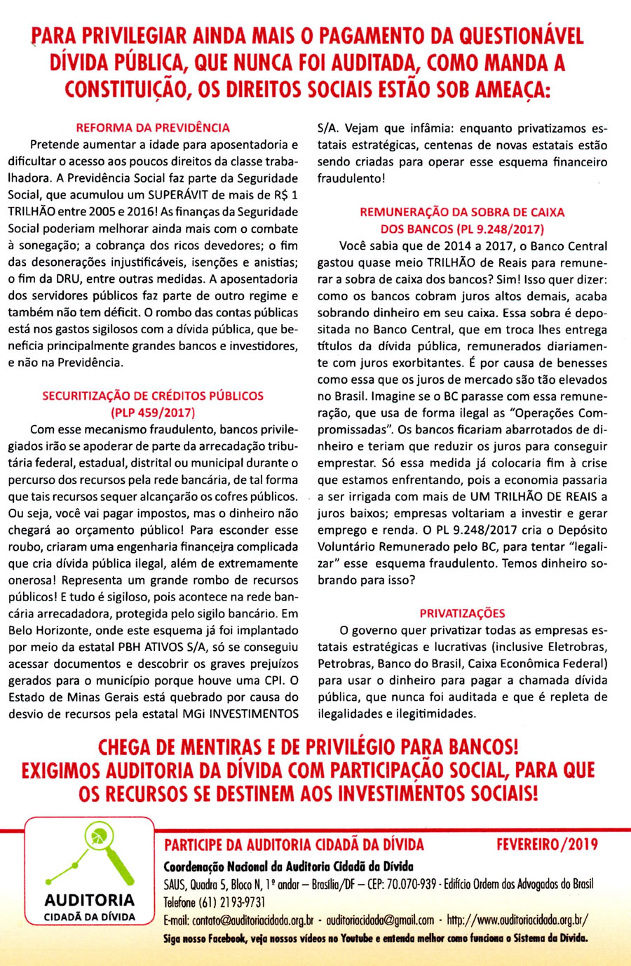 Notícias O rombo das contas públicas está no sistema da dívida, e não na previdência social Facebook Twitter Linkedin Whatsapp Email Conteúdo relacionado Notícias 19/02/2026 TJGO publica Edital de Acordo Direto para Precatórios do Estado de Goiás (01/2026) Notícias 21/01/2026 Diretoria do Sindifisco-GO se reúne com auditores-fiscais da DRF-Goiânia Notícias 15/01/2026 Diretoria do Sindifisco-GO participa de almoço com o deputado Lineu Olimpio