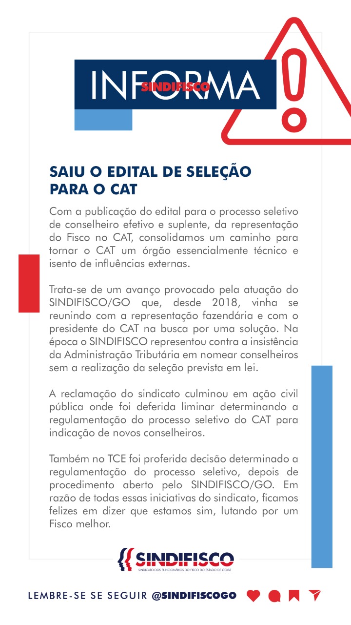 Notícias Saiu o Edital de Seleção para o CAT Facebook Twitter Linkedin Whatsapp Email CLIQUE AQUI E VEJA O DIÁRIO OFICIAL Conteúdo relacionado Notícias 01/04/2026 Diretoria do Sindifisco-GO prestigia a cerimônia de posse do governador Daniel Vilela Notícias 01/04/2026 Fotos e vídeo: Palestra Mês da Mulher 2026 Notícias 30/03/2026 Relatório e parecer do Conselho Fiscal do exercício financeiro de 2025 são aprovados
